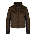 Diese coole sportive Kurzjacke aus edlem changierendem Nylonstoff in Kombination mit schwarzen Stretcheinsätzen lässt sich je nach Styling-Partner zu einem lässigen oder sportlichen Look wandeln. Der große Stehkragen ist mit Kordel und Ösen in der Weite regulierbar. Der Rücken ist doppellagig gearbeitet und mit einem breiten Gummibundabschluss mit dem Sportalm-Logo versehen. Zudem befindet sich am Rücken ein hochwertiges Sportalm-Logo mit Stick und Nieten. Die Ärmel haben modische Raffungen im Ellbogenbereich und einen breiten Abschluss aus Scubabündchen.  Als Verschluss dient ein 2-Wege-Zipp in der vorderen Mitte und zwei Zipptaschen zum Verstauen von Kleinigkeiten wurden im vorderen Bereich der Jacke eingearbeitet. Die Taschen mit Patten im Vorderteil sind nur zur Zierde.